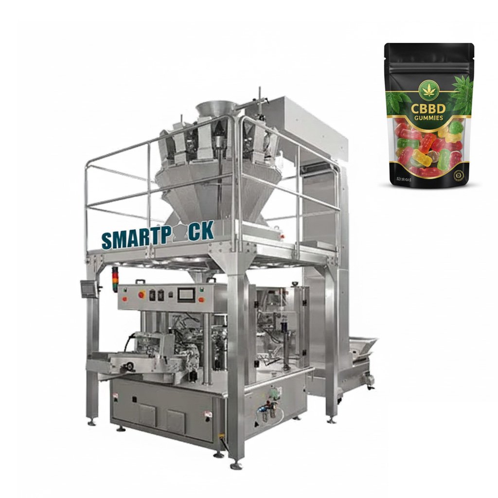 Our pouch packing machine supports barrier films and batch traceability for CBD candy. The multihead weigher and premade pouch filler runs at 30-50 ppm, ensuring label compliance and batch recording for North American regulations.